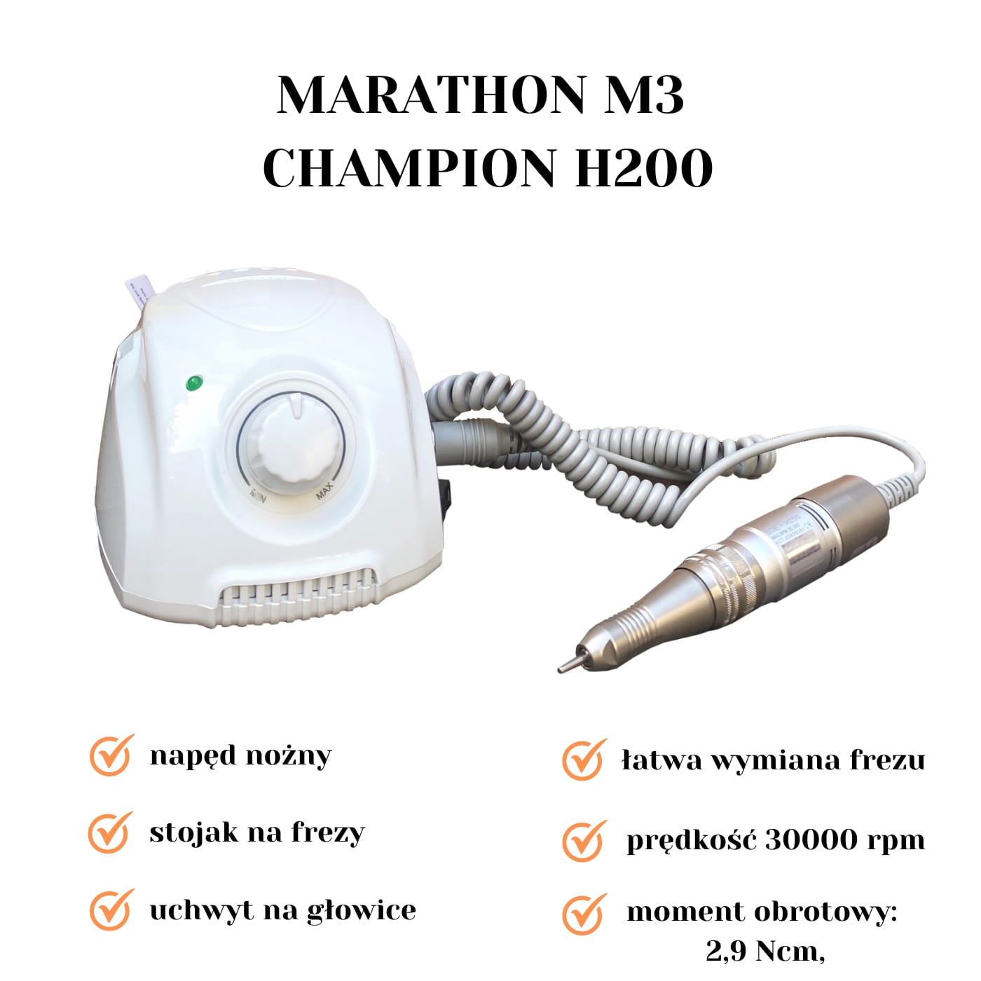 Saeyang Frezarka Marathon 3 Champion White + H200 to profesjonalne urządzenie do manicure i pedicure. Ergonomiczna głowica H200, system Twist-Lock, prędkość do 30 000 RPM, i napęd nożny zapewniają komfort i precyzję pracy. Doskonała do użytku profesjonalnego i domowego.