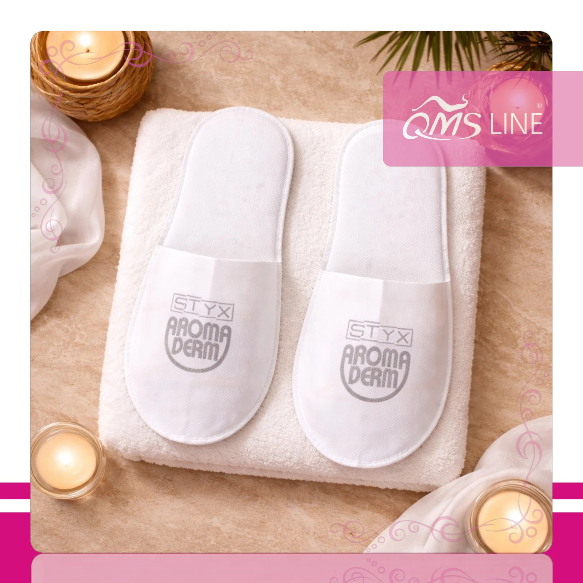 • Kapcie z logo Aroma Derm pakowane pojedynczo 1 para QMS Line Extra do salonu kosmetycznego i SPA