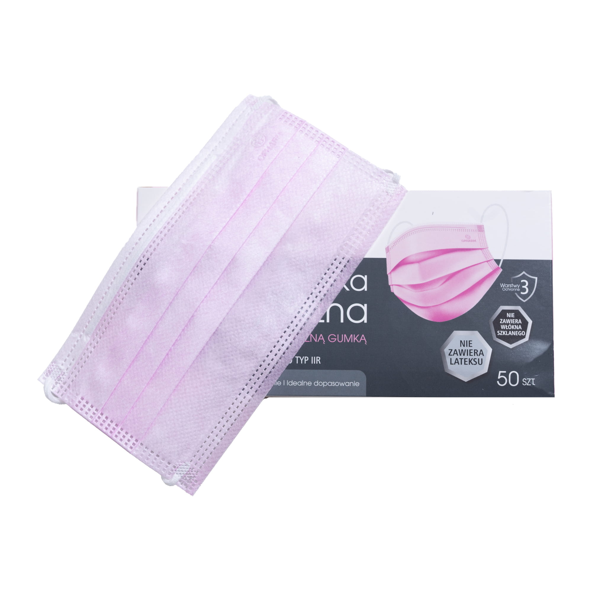 Maska chirurgiczna medyczna różowa 50 szt. – 3 warstwowa, z gumką, zapewnia filtrację BFE >98%, chroniąc przed bakteriami, wirusami i zanieczyszczeniami. Komfortowa, miła w dotyku, odporna na zachlapania. Wyprodukowana w Polsce, zgodna z normą EN:14683:2019.