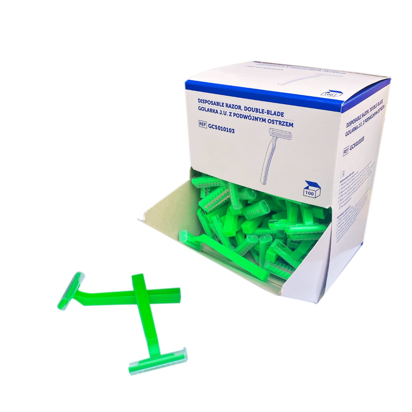 Maszynki do golenia jednorazowe z dwoma ostrzami – 100 szt. Zielony uchwyt, precyzyjne cięcie i wygodne użytkowanie. Idealne do hoteli, salonów kosmetycznych i użytku domowego.