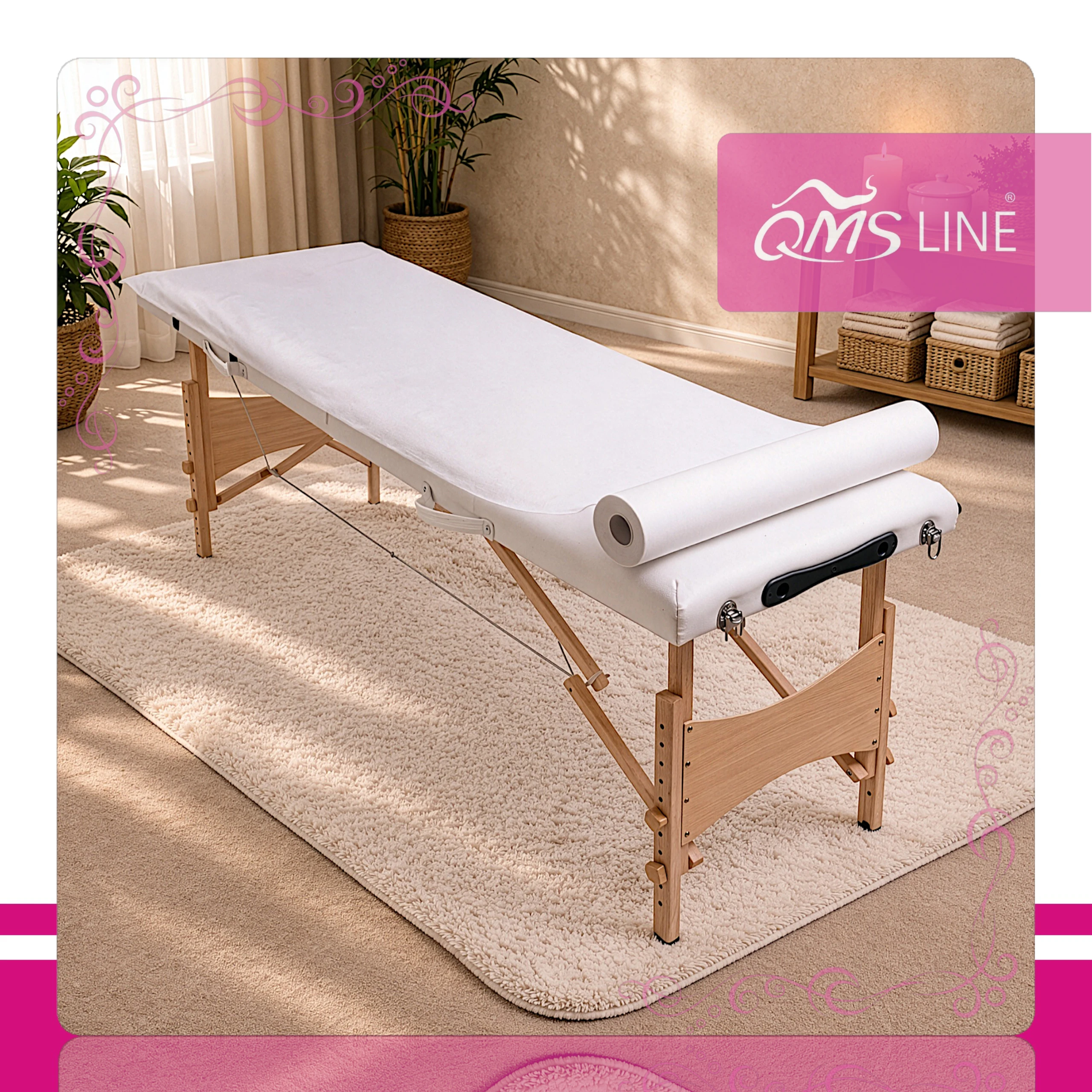 Podkład kosmetyczny jednorazowy z włókniny 60 cm x 50 m, 27g. Idealny do zabiegów kosmetycznych, zapewniający wygodę i higienę. Wybierz QMS Line Extra – profesjonalna jakość i komfort!