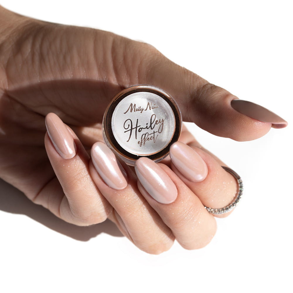 Pyłek Hailey Effect Molly Nails to drobno zmielony pigment do zdobień paznokci. Dzięki temu umożliwia uzyskanie perłowej tafli z subtelnym połyskiem.